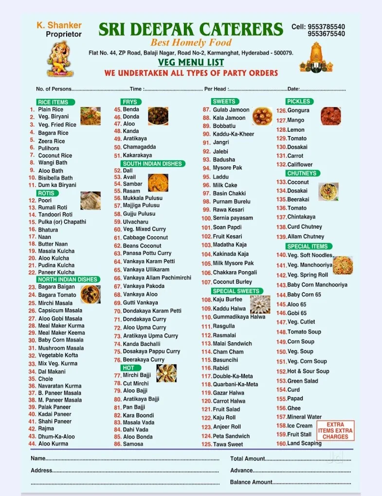 Sri Deepak Caterers is a well-rated catering service based in Hyderabad, Telangana, known for providing high-quality food and professional catering solutions for a wide range of events. Their offerings include catering for weddings, corporate gatherings, birthday parties, family celebrations, and other special occasions. They have over 14+ years of experience in the catering industry and have catered 500+ events